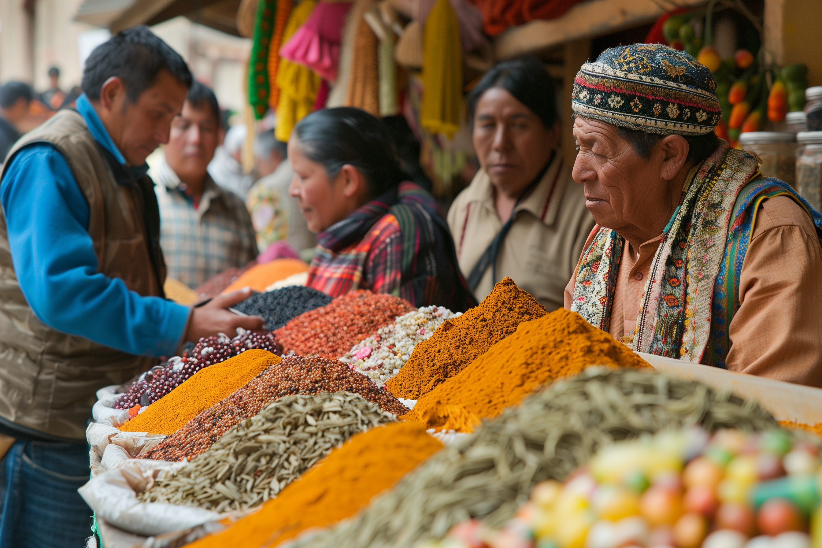 Das Foto zeigt einen bunten Gewürzmarkt in Asien. Im Vordergrund sind verschiedene Haufen an Gewürzen und Lebensmitteln zu sehen, darunter Kurkuma, Chili, Gewürzmischungen und andere typische Zutaten der asiatischen Küche. Im Hintergrund sind mehrere Personen zu erkennen, die offenbar als Verkäufer arbeiten und die Waren feilbieten. Das Bild ist farbenfroh, lebendig und vermittelt einen authentischen Eindruck vom traditionellen Marktgeschehen in dieser Region.