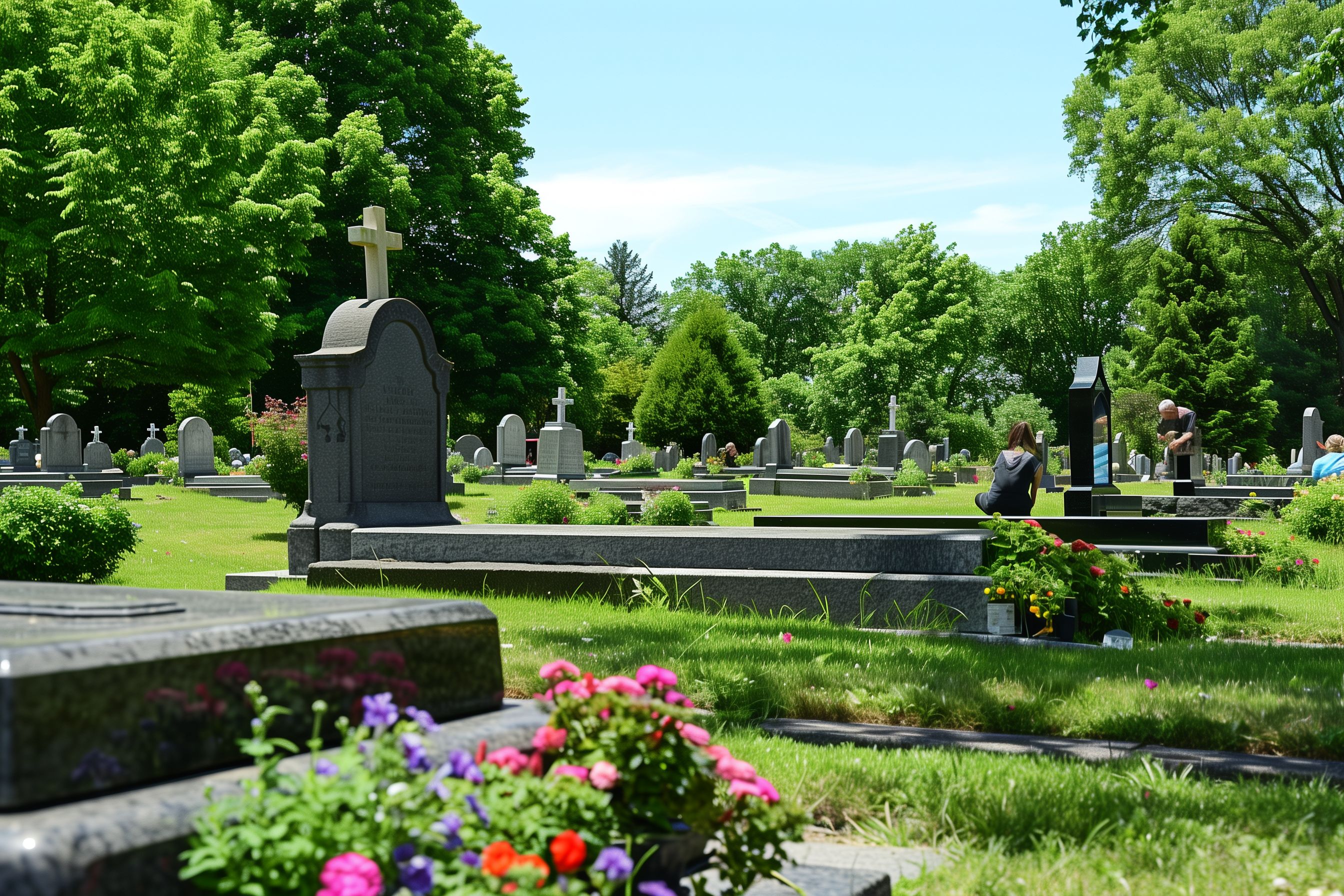 Das Foto zeigt einen friedlichen Friedhof inmitten einer grünen Parklandschaft. Der Vordergrund ist geprägt von Grabsteinen und Kreuzen, umgeben von blühenden Blumen und üppiger Vegetation. Im Hintergrund sind hohe Bäume und ein wolkenloser Himmel zu sehen, was der Szene eine ruhige und meditative Atmosphäre verleiht. Dieses kostenlose Stockfoto in hoher Auflösung kann für verschiedene Zwecke wie Blogs, Newsletter, Social-Media-Beiträge oder Werbematerialien genutzt werden, wobei es unter der Creative-Commons-Lizenz steht.