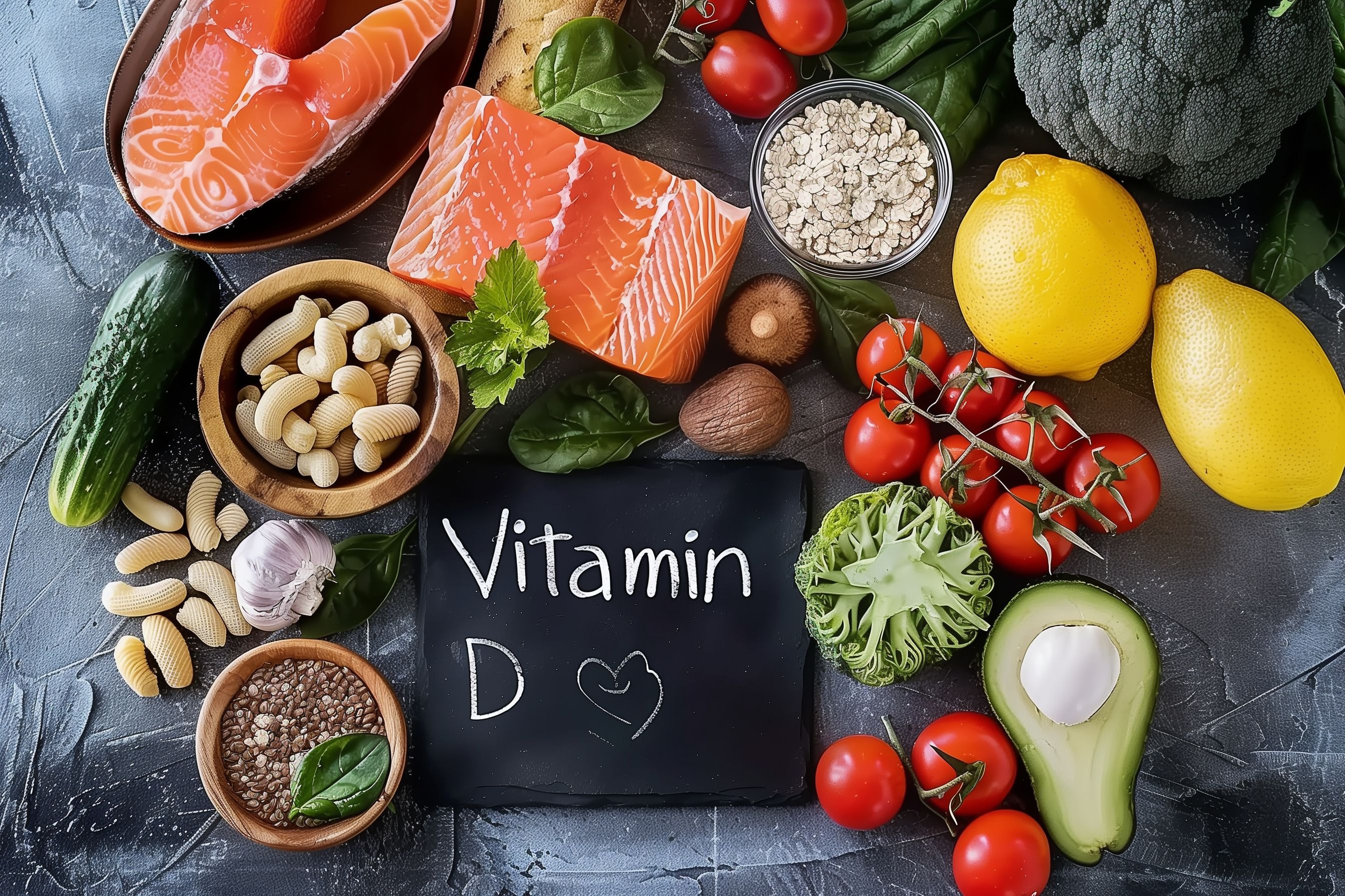 Dieses Foto zeigt eine Auswahl an frischen, vitaminreichen Lebensmitteln auf einem dunklen Hintergrund. Im Zentrum steht eine Tafel mit der Aufschrift 'Vitamin D', umgeben von Lachssteak, Zitronen, Gemüse wie Brokkolli, Tomaten und Avocado sowie Nüssen und Samen. Die Anordnung der Lebensmittel in rustikaler Optik vermittelt den Eindruck einer ausgewogenen, gesunden Ernährung. Dieses Bild eignet sich hervorragend als kostenloses Stockfoto für Blogs, Newsletter oder Social-Media-Beiträge rund um die Themen Gesundheit, Fitness und Ernährung. Es ist in hoher Auflösung verfügbar und unter einer Creative-Commons-Lizenz nutzbar.