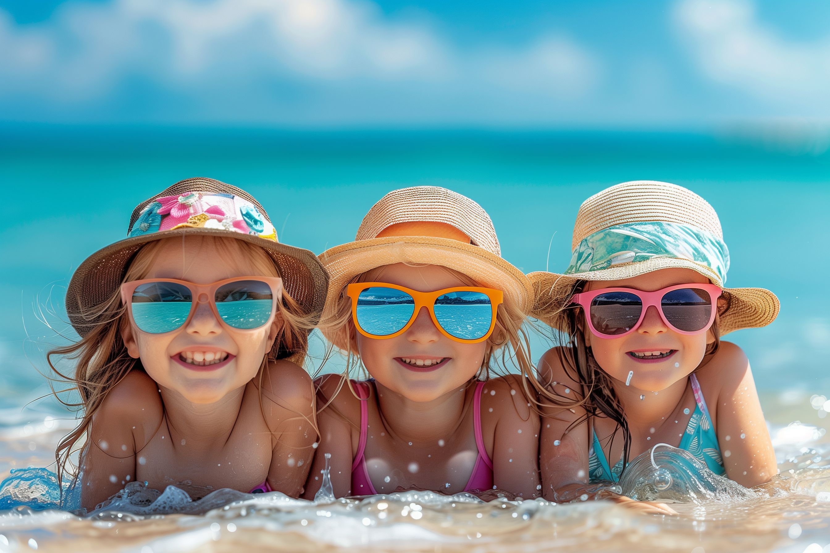 Das Foto zeigt drei glückliche Kinder, die sich am sonnigen Strand vergnügen. Sie tragen Strohhüte, Sonnenbrillen und Badeanzüge und lächeln strahlend in die Kamera. Das türkisfarbene Wasser und der blaue Himmel mit weißen Wolken bilden eine wunderschöne, sommerliche Kulisse. Das Foto vermittelt eine Atmosphäre von Spaß, Freiheit und Erholung. Es eignet sich hervorragend als kostenloses Stockfoto für Blogs, Websites, Soziale Medien und Werbekampagnen zu den Themen Sommer, Urlaub, Familie und Lifestyle. Das Bild ist in hoher Auflösung verfügbar und unter der Creative Commons-Lizenz nutzbar.