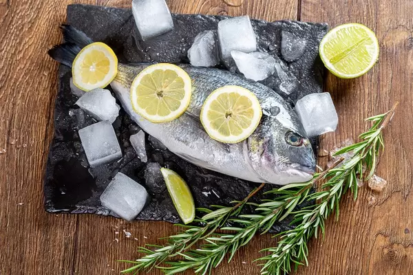 Raw Dorado fish with ice and lemon slices close-up (Flip 2019)