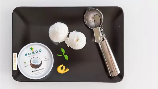 Instagrambild von Foodblooger zeigt das vegane Nomoo - Kokosnusseis mit Eiskugeln und Eislöffel aus der Sicht von oben