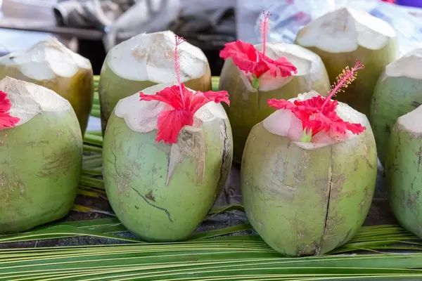 Green coconuts on palm leaves decorated with red amaryllis flowers at a Beach Bar of Anse Source d'Argent in La Digue, Seychelles Island