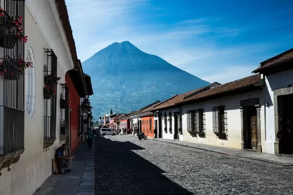 Straße mit typischen bunten Häuserfassaden in Antigua, Guatemala vor dem Volcan de Agua