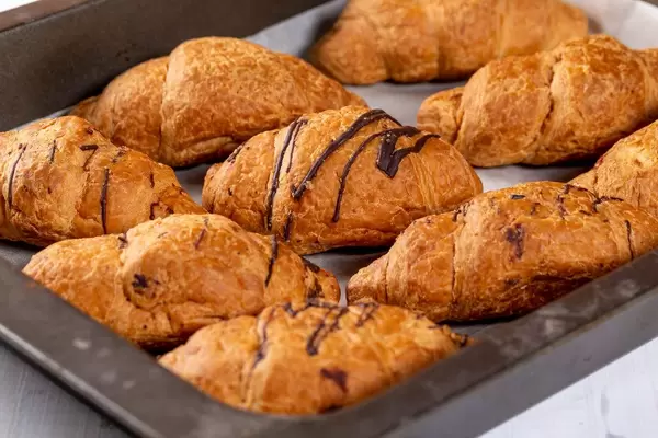Frisch gebackene Schoko-Croissants auf einem Backblech