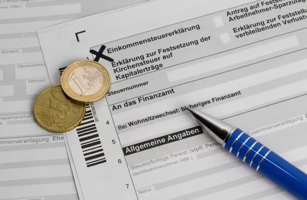 Formular Einkommensteuererklärung mit Kugelschreiber und Euromünzen