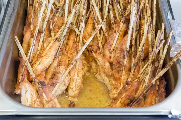 Weintrauben an Spießen in einem Schokoladenbrunnen