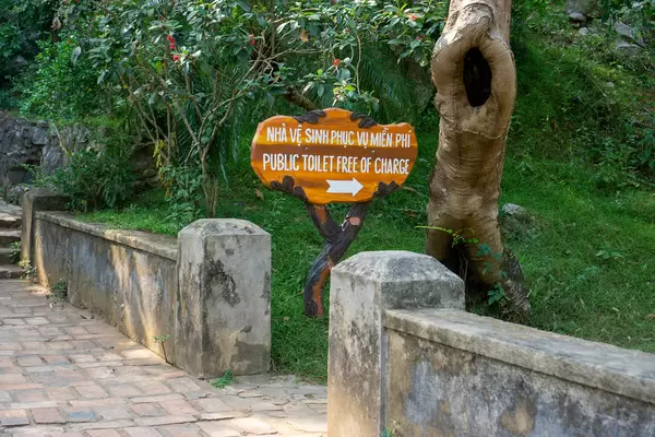 Wegbeschreibung zu einer öffentlichen Toilette auf einem Holzschild bei der Touristenattraktion Marble Mountains in Da Nang, Vietnam