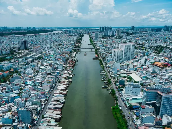 Aerial Drone Photo of Ships on Saigon River along local Houses and Neigborhoods with a View to District 2 in Ho Chi Minh City, Vietnam