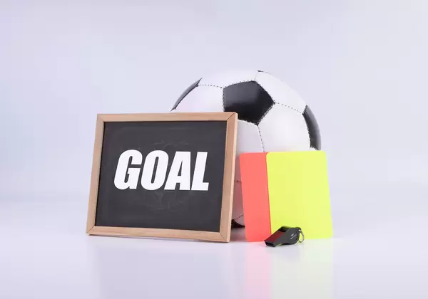 Soccer ball, referee cards and chalkboard with Goal text