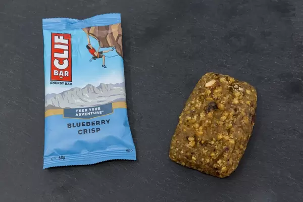 Clif Bar - Energy Bar with Blueberry Crisp Flavor and Packaging on black plate