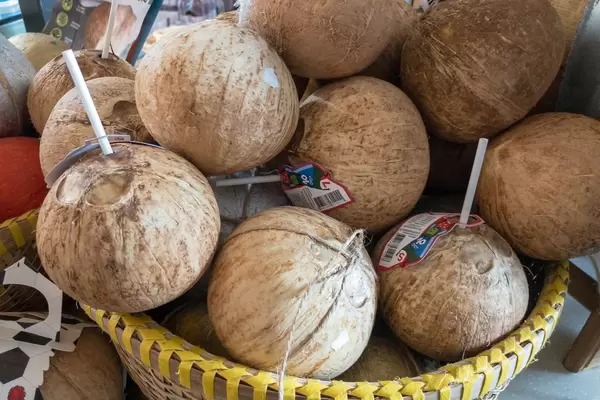 Young coconuts with drinking straws at Danilovsky Market in Moscow