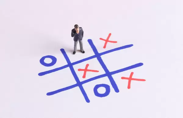 Tic Tac Toe game and miniature businessman on white paper