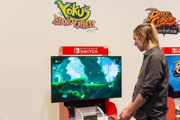 Besucher spielt Yokus Island Express auf der Nintendo Switch - Gamescom 2017, Köln