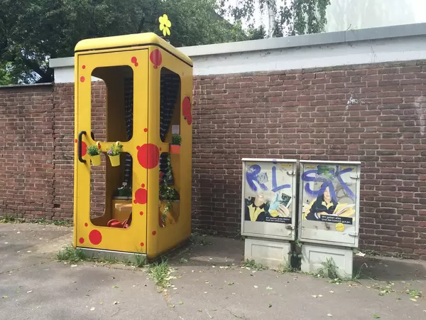 Mit Blumen dekorierte Telefonzelle in Köln
