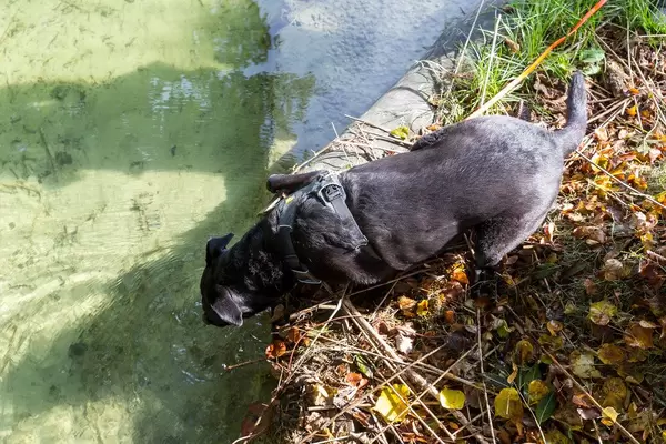 Schwarzer Hund trinkt Wasser eines Sees in Tirol. Aufnahme von oben im Herbst