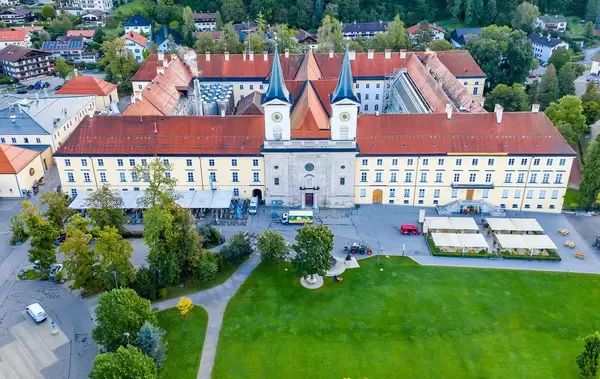 Tegernsee Abbey: former Benedictine monastery, now known as Schloss Tegernsee brewery. Aerial pic