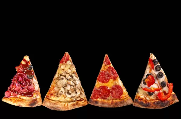 Close-up, slices of different types of pizza. Fast food delicious background