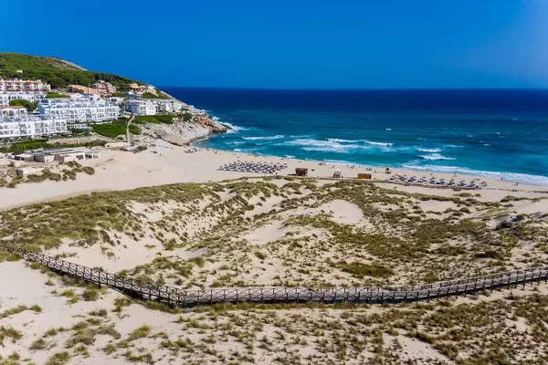 Walkway on the dunes with scanty vegetation by the beach of Cala Mesquida, Mallorca. Aerial view