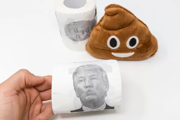 Hand holds a loo roll with Donald Trump's face, in the background a fluffy emoji poop plush toy