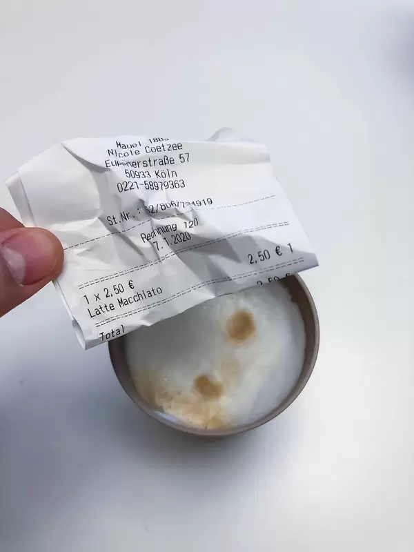 Hand hält einen Beleg für den Kauf von einem Latte Macchiato in einem Café in Köln
