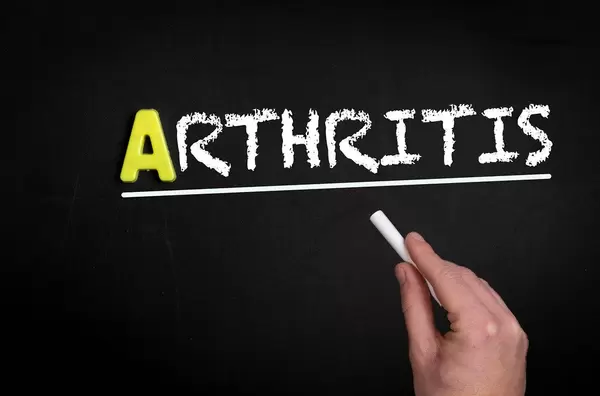 Hand schreibt das Wort "Arthritis" mit Kreide auf eine schwarze Tafel