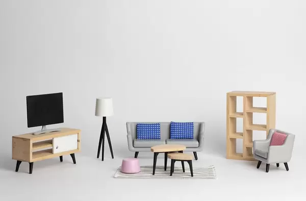 Modelled living room furniture in Scandinavian style on white background
