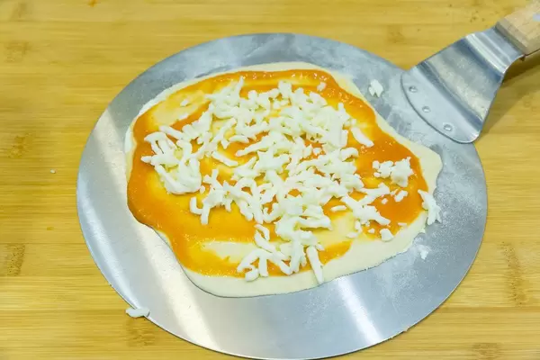 Rohe, ungebackene Pizza Margherita auf einem Pizzaschieber des Pizzakits von Philips Airfryer XXL