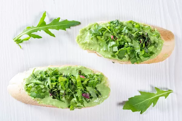 Croutons with avocado guacamole with arugula leaves