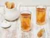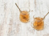 Person holding a Small Glass Bottle of Freshly Pressed Juice with Carrot, Apple and Passion Fruit as Immunity Booster in front of rustic Background